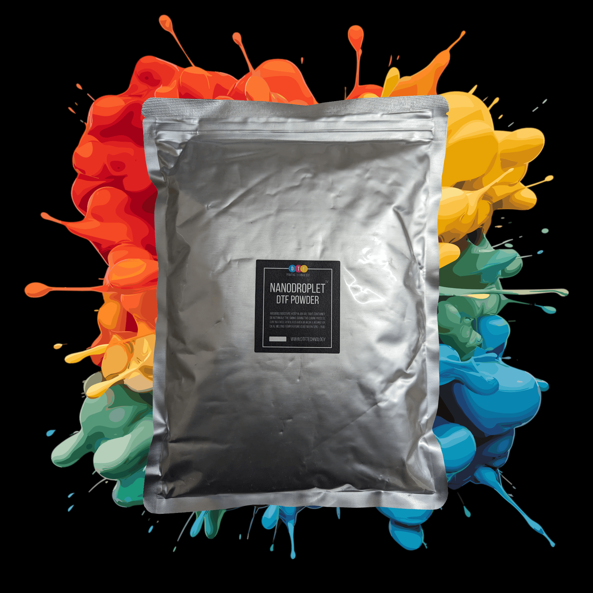 DTF powder, also known as a hot melt adhesive, has been specifically formulated for use with DTF printing. Our powders offer superb adherence, great washability and stick precisely to ink and not the film.
