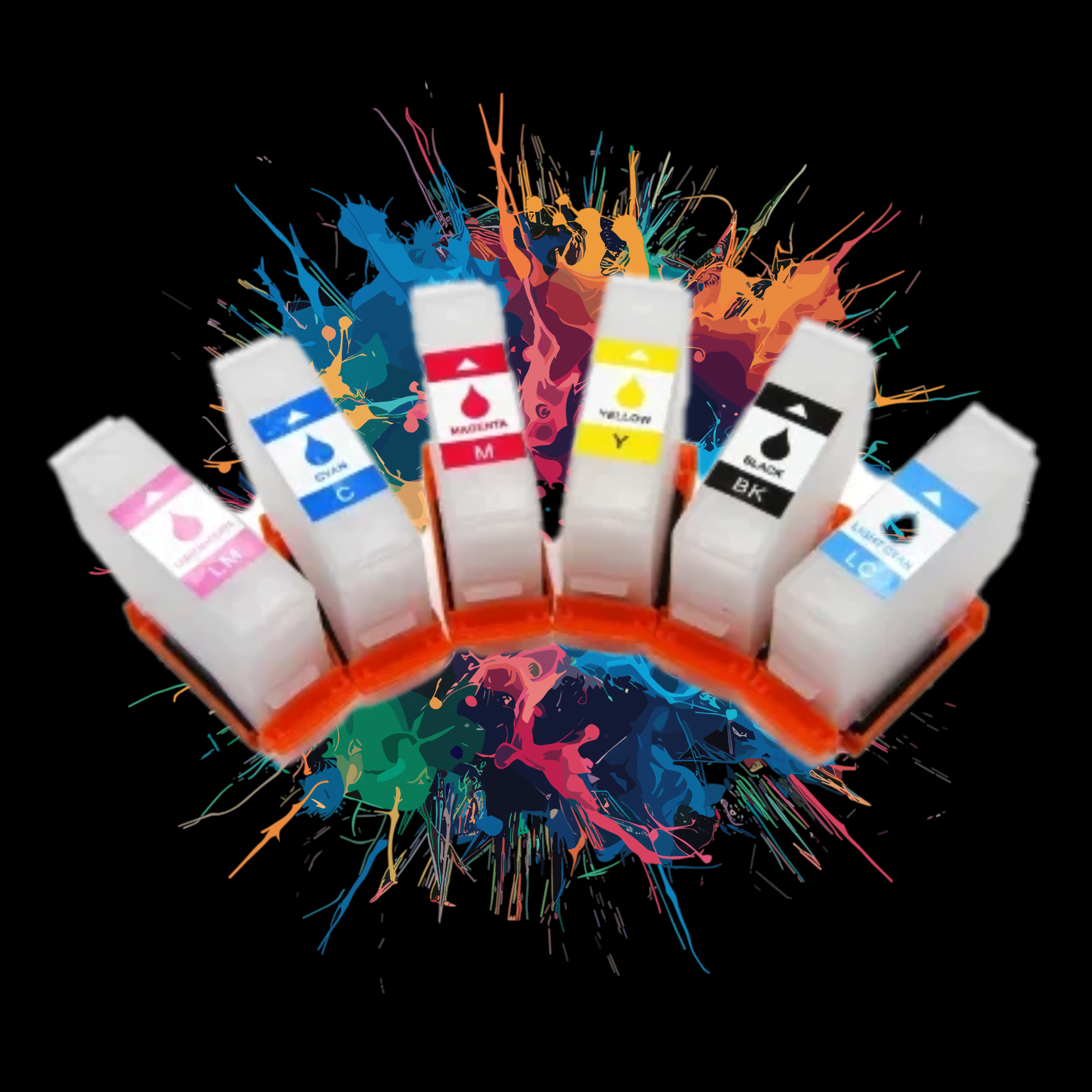 A set of 6 refillable ink cartridges for Epson xp-15000 type printers. Does not include a chip and will require chipless firmware to be installed on your printer such as the one from inkchip.net. Compatible with Epson Epson XP-15000 XP-15010 XP-15080 XP15010 XP15080 models. UP 378XL 478XL T312 T314 cartridge numbers.